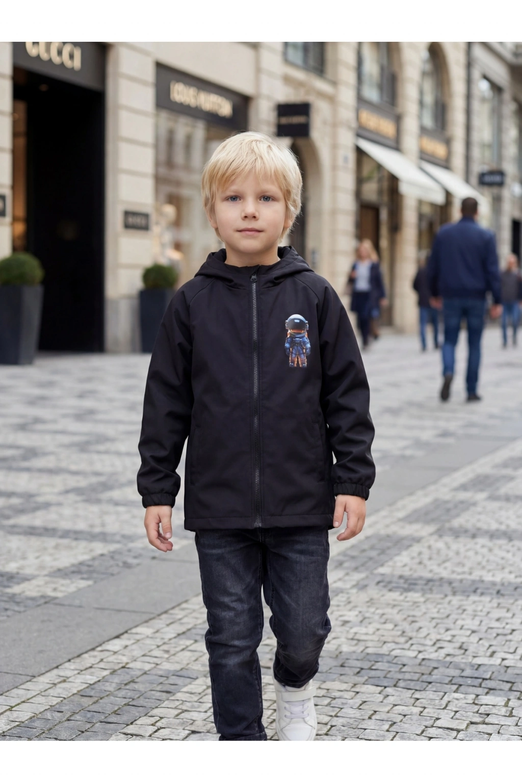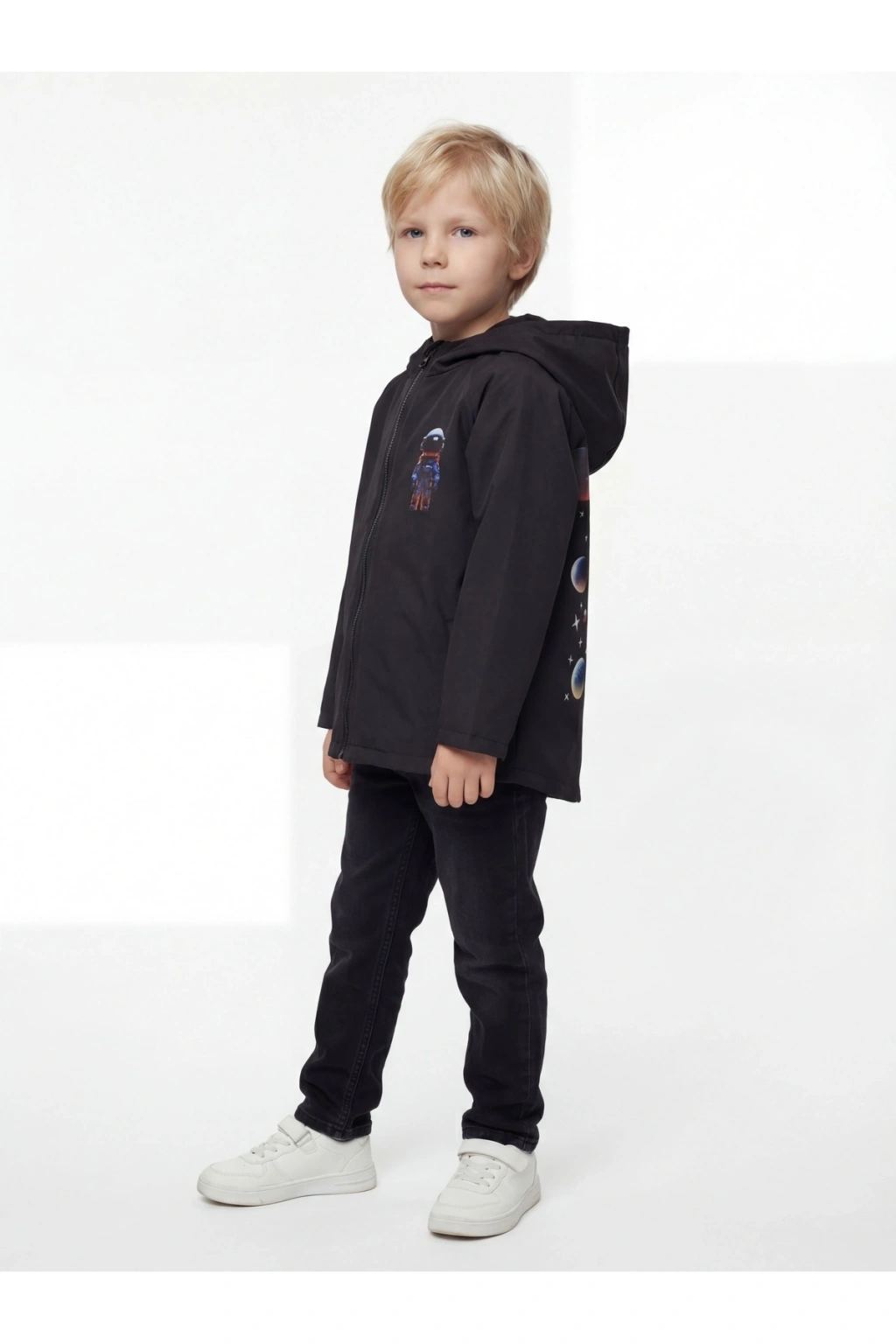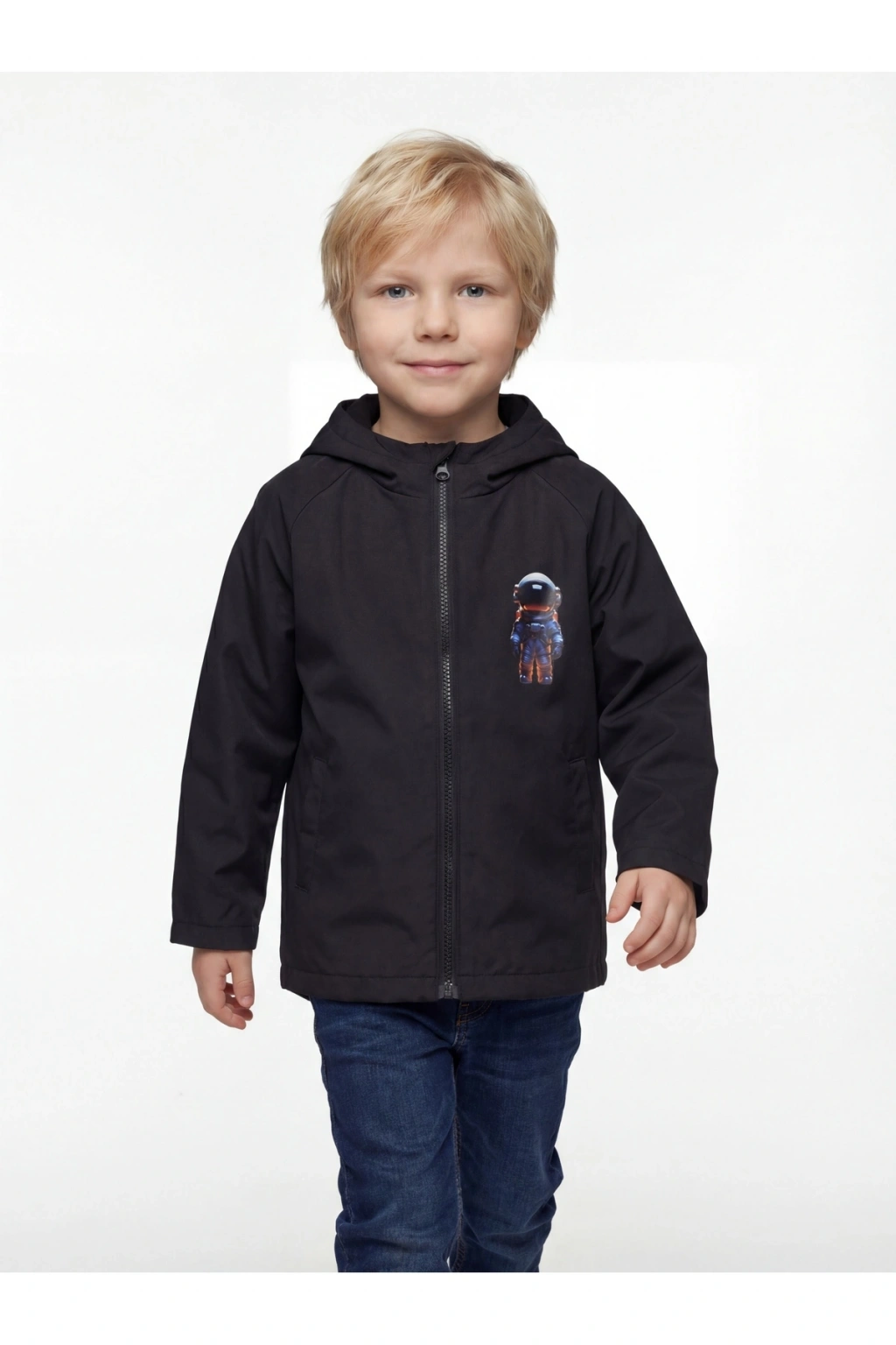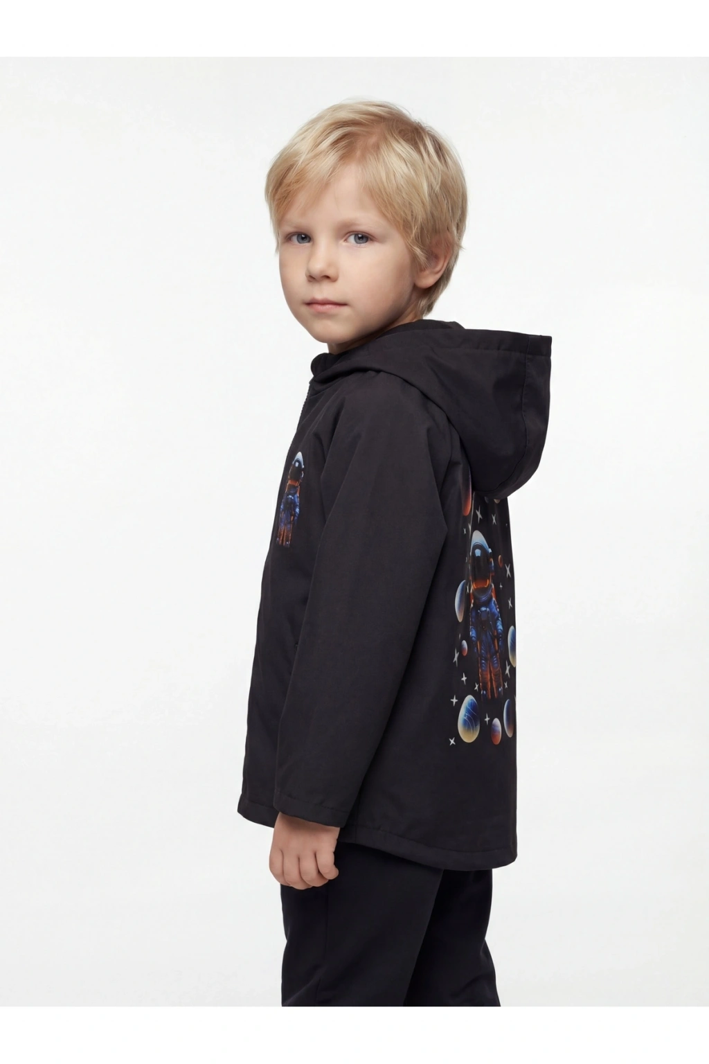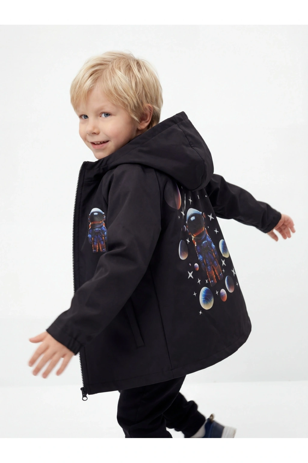 Erkek Çocuk Su Ve Rüzgar Geçirmez Uzay Temalı Siyah Trençkot-yağmurluk-rüzgarlık