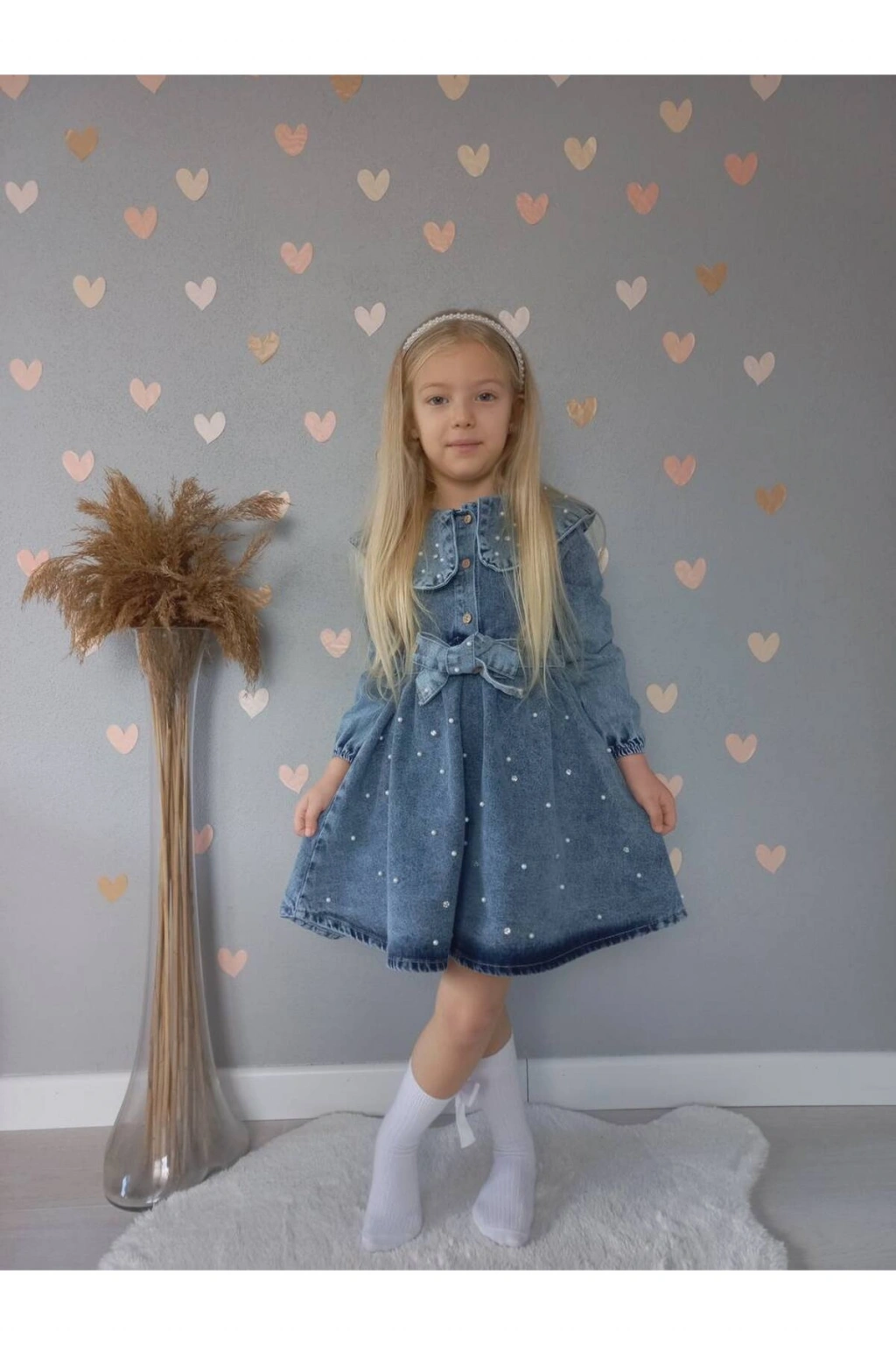 KIZ ÇOCUK İNCİLİ KOT ELBİSE/JEANS ELBİSE-BAYRAMLIK