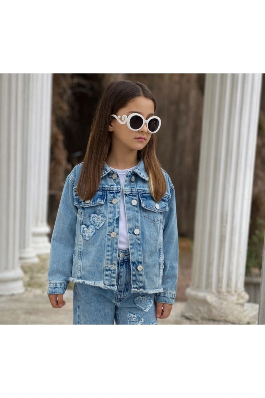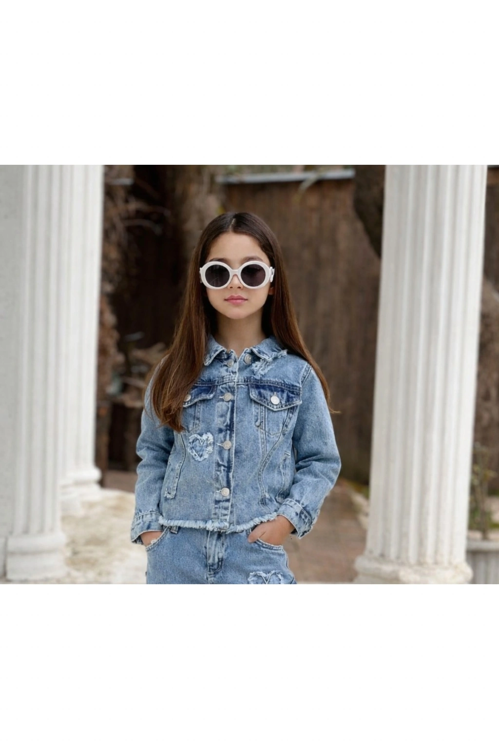 Kız Çocuk Kalpli Eskitmeli Mavi Kot Ceket-Jeans Ceket/Kot Mont-Jeans Mont-BAYRAMLIK