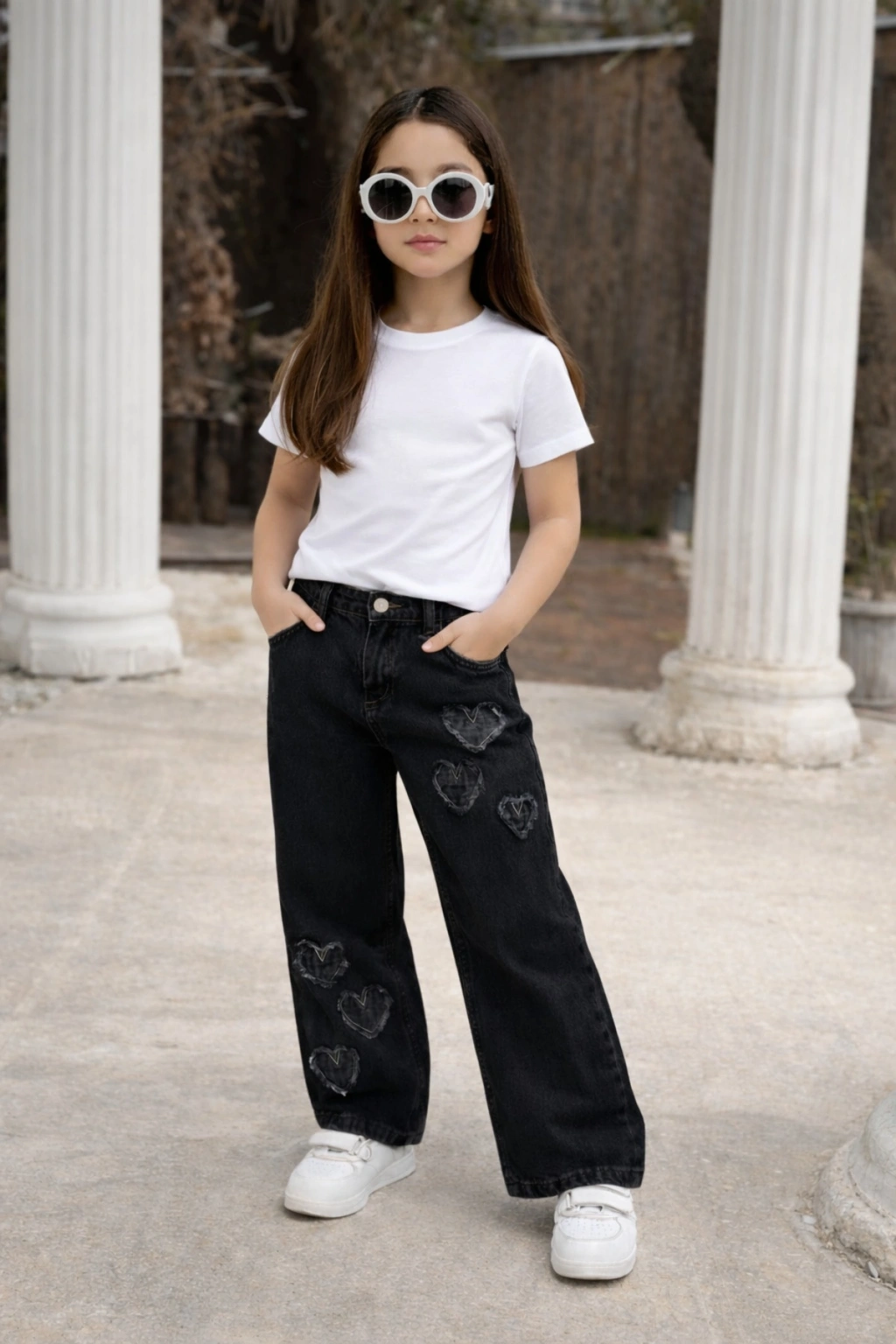 KIZ ÇOCUK KALPLİ ESKİTMELİ BOL PAÇA SİYAH KOT PANTOLON (JEANS-DENİM)-BAYRAMLIK