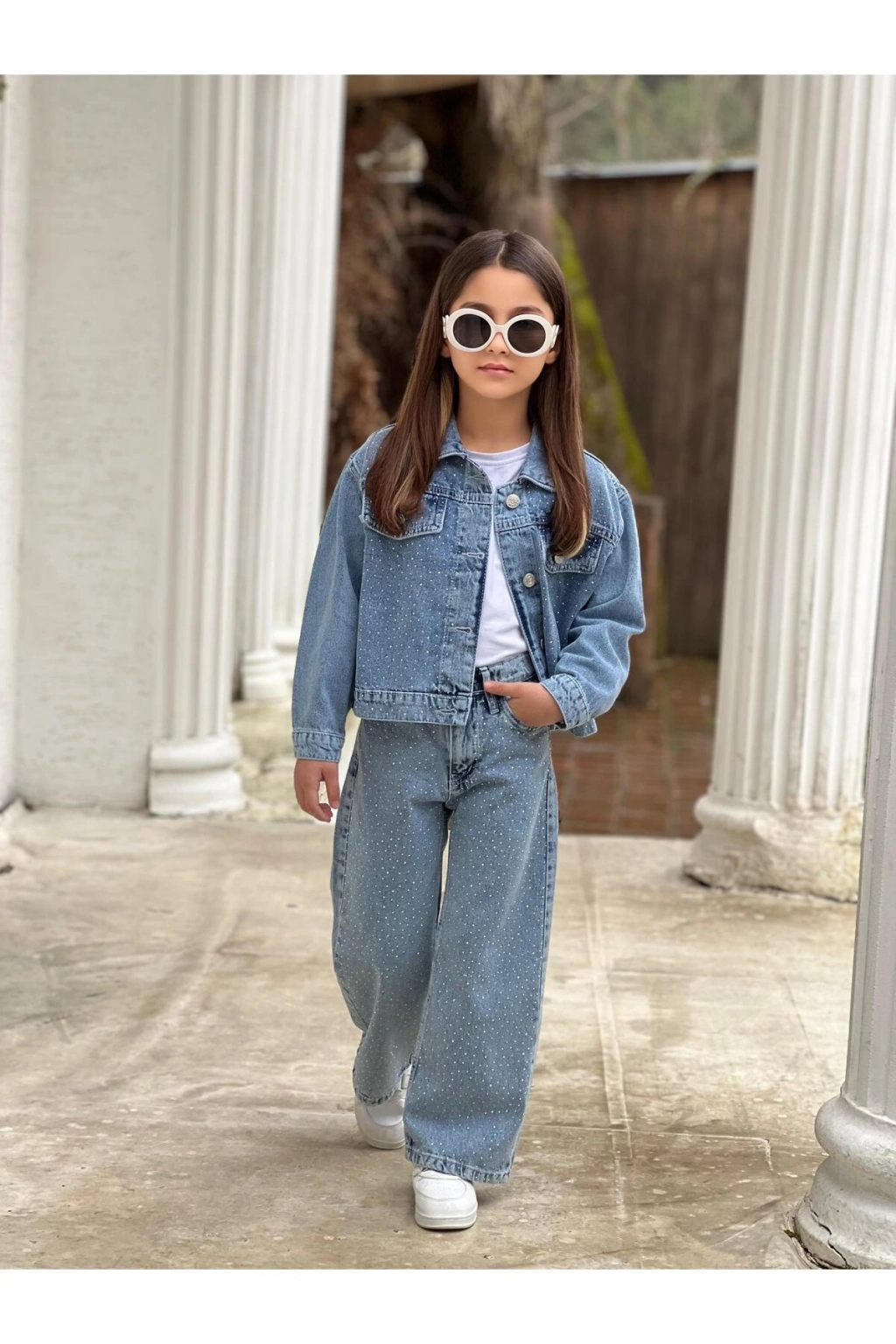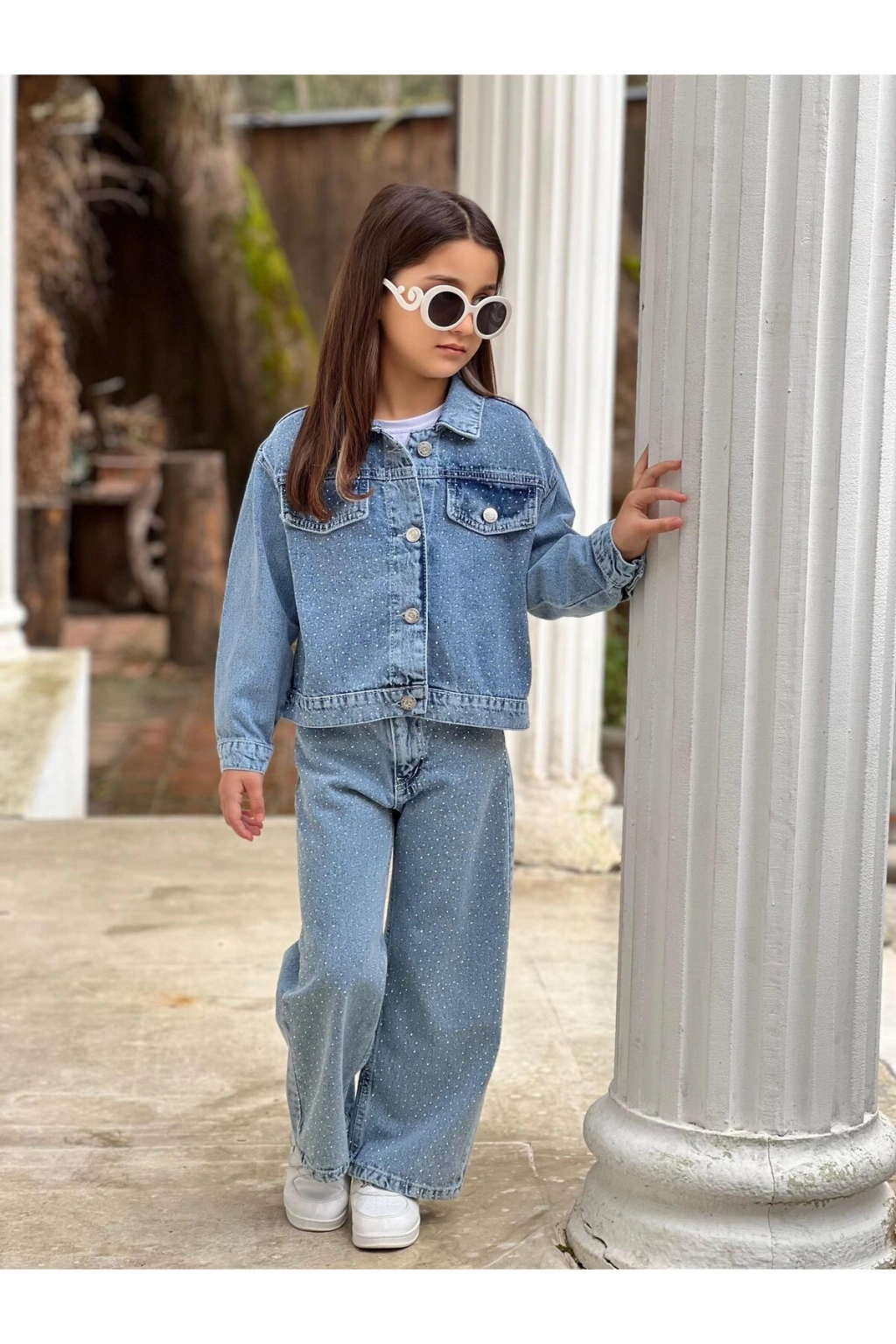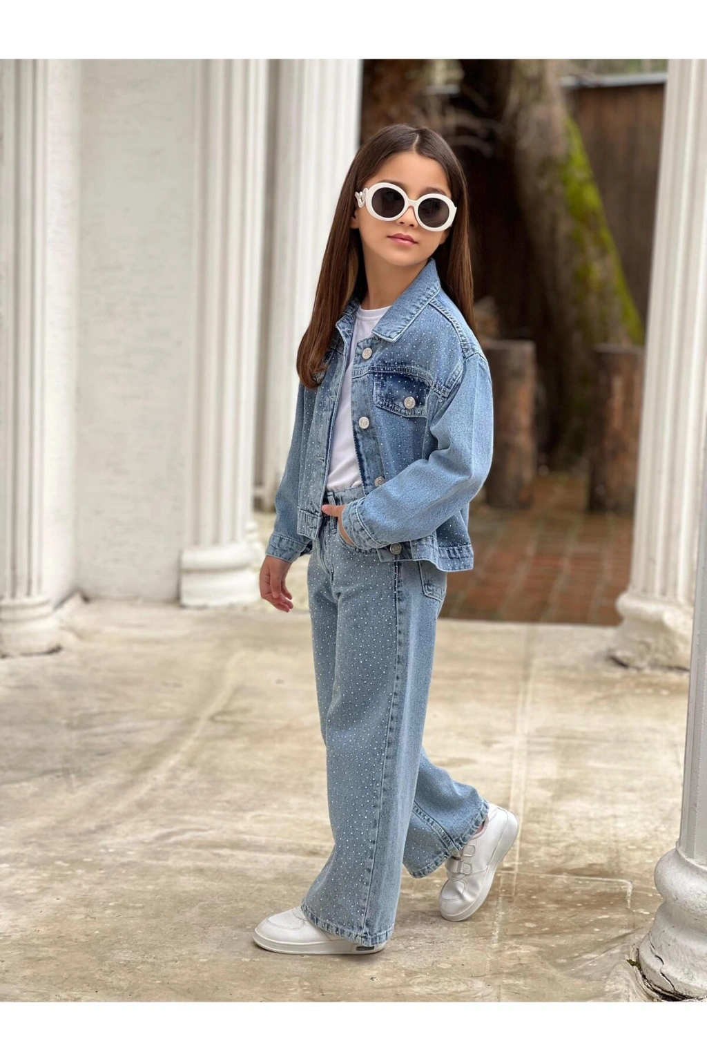 KIZ ÇOCUK KOMPLE TAŞLI MAVİ KOT PANTOLON VE KOT CEKET TAKIM-BAYRAMLIK