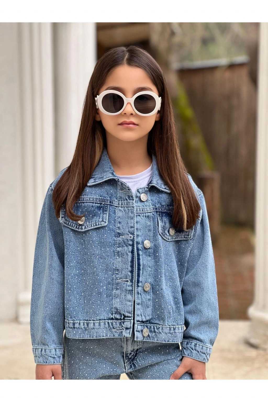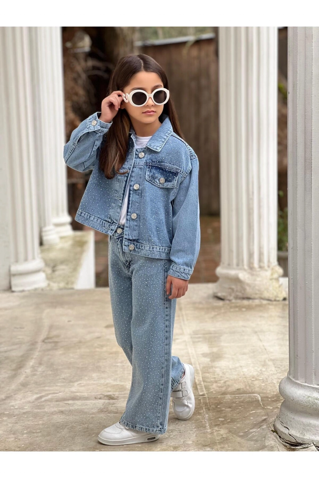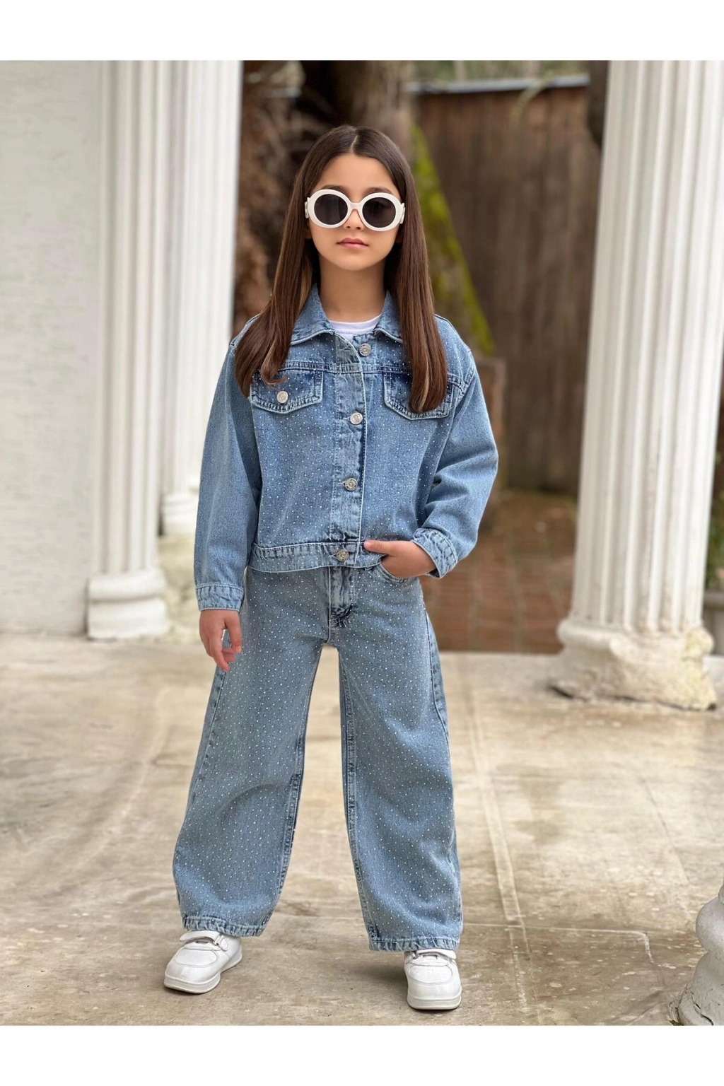 KIZ ÇOCUK KOMPLE TAŞLI MAVİ KOT PANTOLON VE KOT CEKET TAKIM-BAYRAMLIK