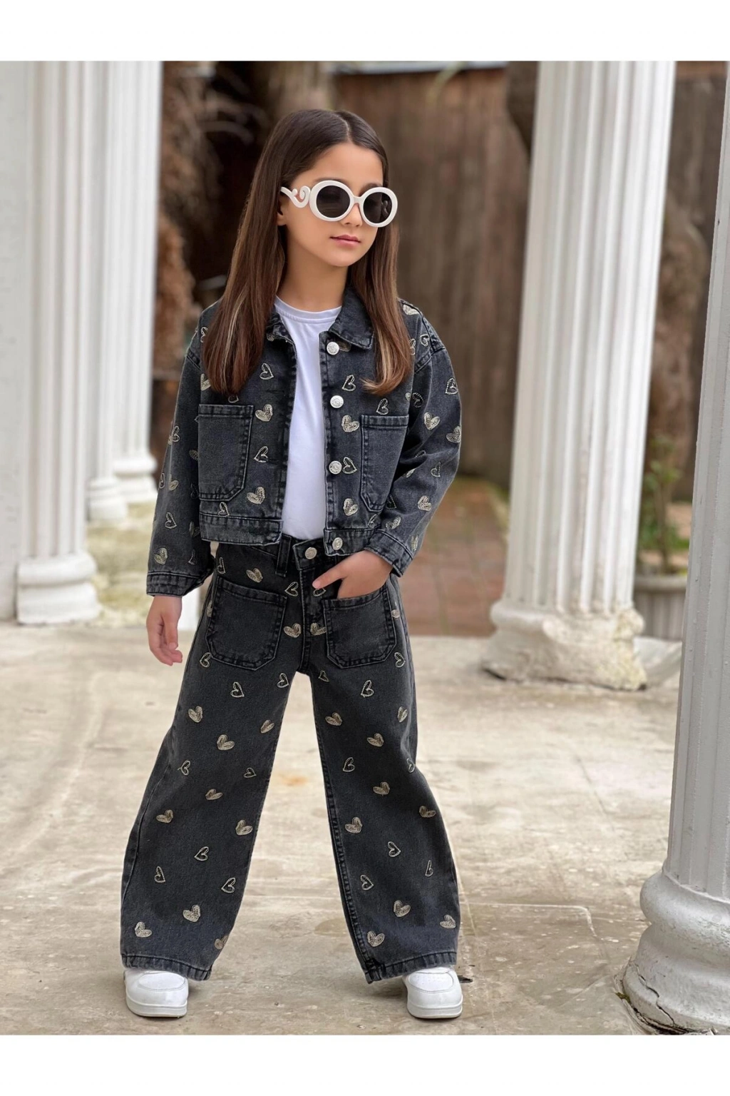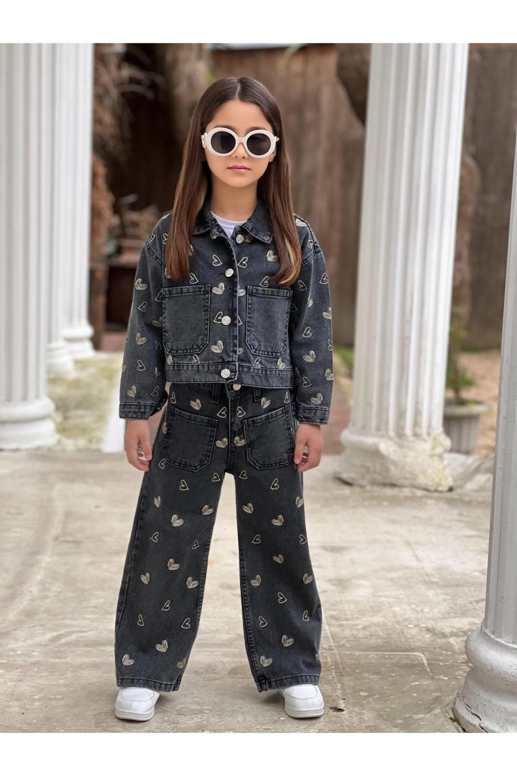 KIZ ÇOCUK NAKIŞLI SİYAH KOT PANTOLON VE KOT CEKET TAKIM-BAYRAMLIK