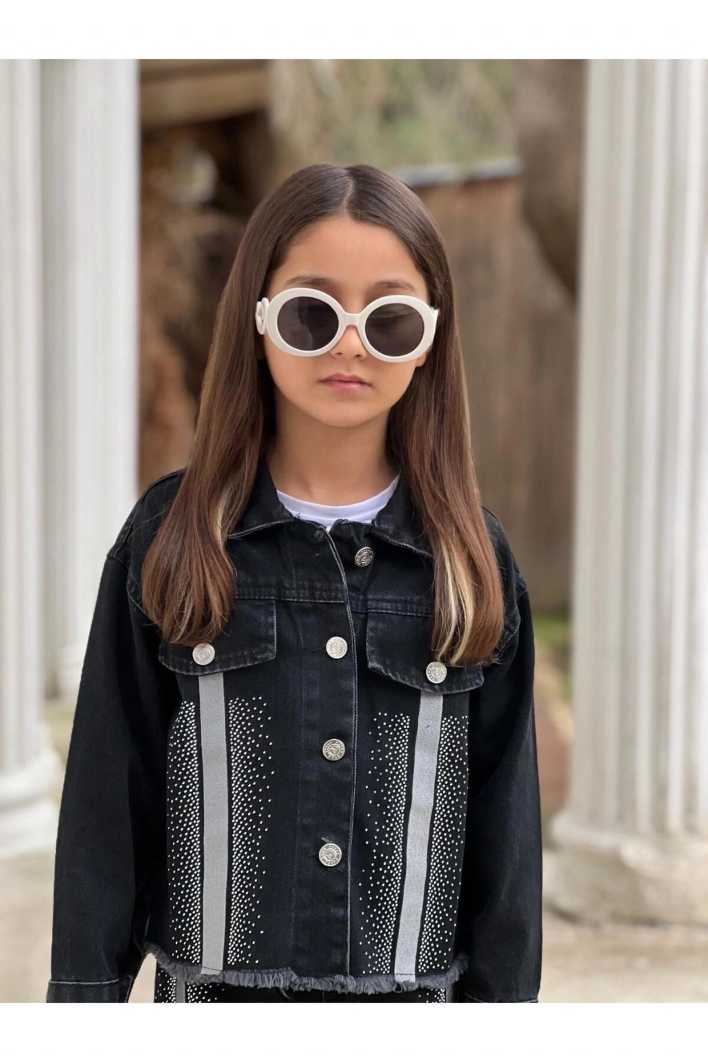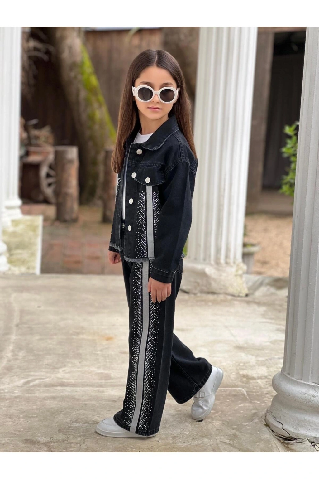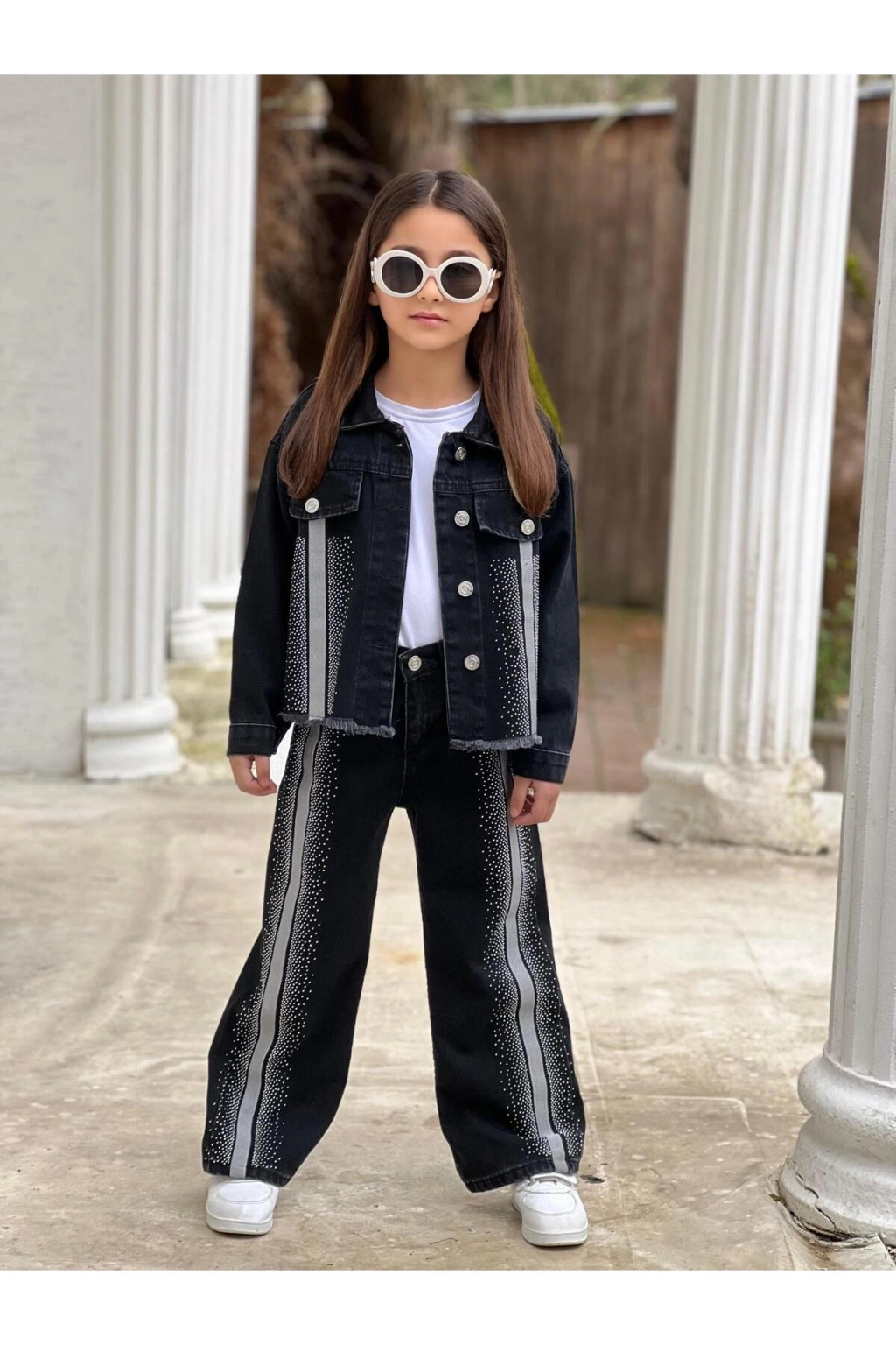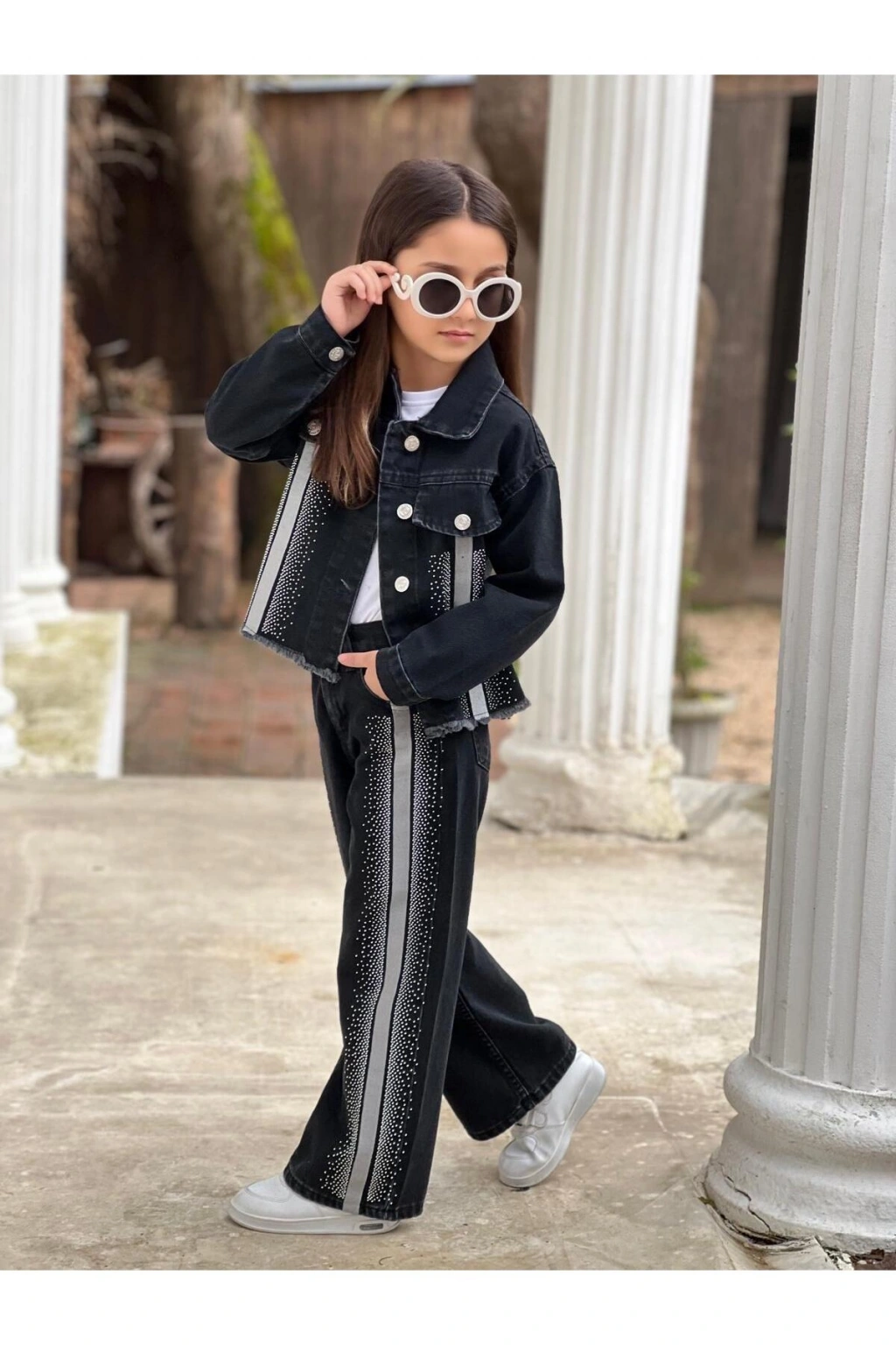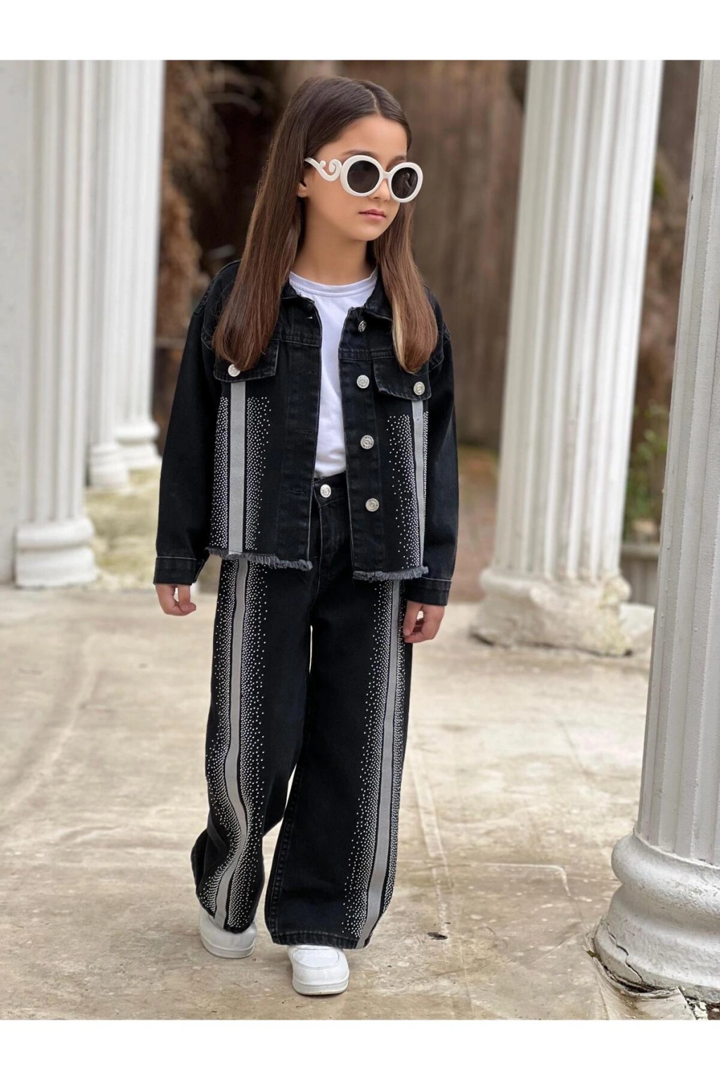 KIZ ÇOCUK ŞERİTLİ TAŞLI SİYAH KOT PANTOLON VE KOT CEKET TAKIM-BAYRAMLIK