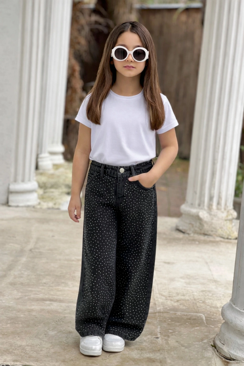 KIZ ÇOCUK SİYAH KOMPLE TAŞLI BOL PAÇA KOT PANTOLON (JEANS-DENİM)-BAYRAMLIK