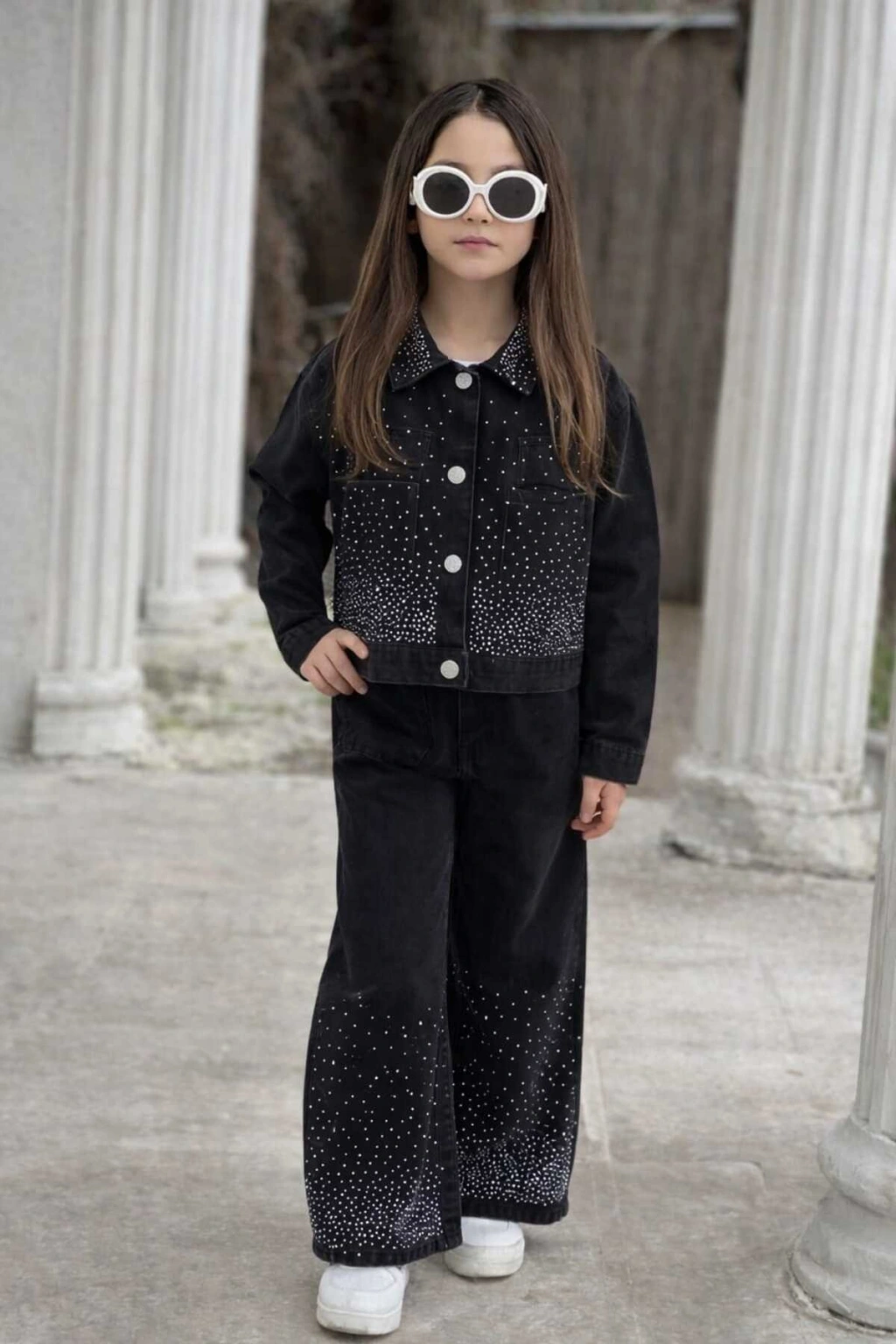 KIZ ÇOCUK YAKASI TAŞLI SİYAH KOT PANTOLON VE KOT CEKET TAKIM-BAYRAMLIK